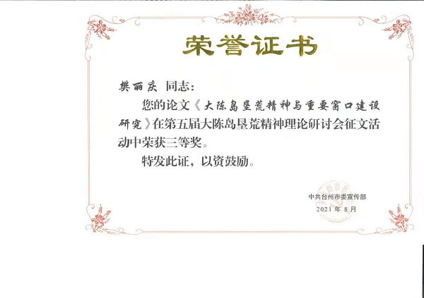 会上公布了本次研讨会征文活动的比赛结果,我校学生处处长樊丽庆撰写的论文《大陈岛垦荒精神与“重要窗口”建设研究》获得三等奖。据悉,本次研讨会征文活动共征集到理论文章143篇,经专家组评选,共评出一等奖5篇、二等奖10篇、三等奖20篇。