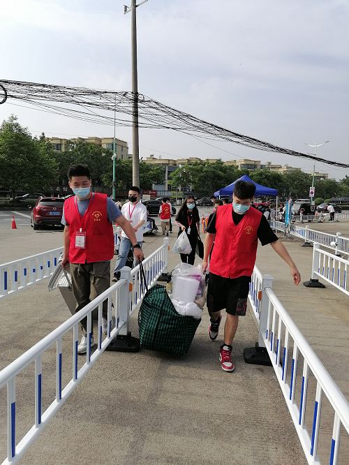 学生返校复课第一道程序是有序进校。学生工作、安全保卫、后勤管理线工作人员及志愿者守候在各个岗位。返校的同学按照现场安保人员指引,每人间隔一米排队,自正大门四条通道入校,经身份确认、绿码核验、体温检测,未发现异常方可进入。随身携带的行李也会经过一道”检验工序”,须经过消毒才可带入宿舍。同时设置大件行李志愿者服务队,由爱心车队协助运送。