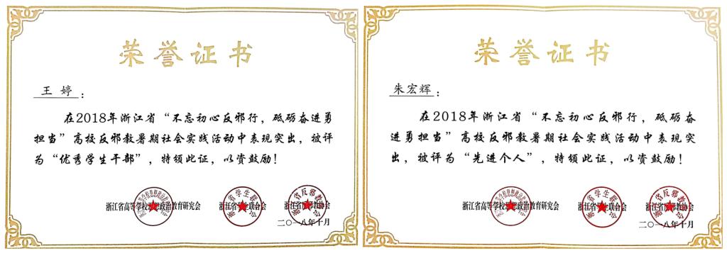 由浙江省高等学校思想政治教育研究会、浙江省学生联合会和浙江省反邪教协会联合举办的以“不忘初心反邪行,砥砺奋进勇担当”为主题的2018反邪教暑期社会实践活动。我校反邪教实践队在全省73支高校实践团队中脱颖而出,荣获二等奖。其中,我校姚瑜滢老师被评为“2018年全省高校反邪教暑期社会实践优秀指导老师”,我校朱宏辉同学被评为“2018年全省高校反邪教暑期社会实践先进个人”,我校王婷同学被评为“2018年全省高校反邪教协会优秀学生干部”。