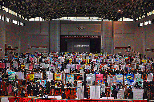 九点三十分,前来应聘的第一批学生进入会场,整个会场瞬间变得拥挤和热闹起来,交流声,讨论声不绝于耳,问专业,询领域,讲发展,谈待遇,企业招聘人员和学生或站或坐,互相交谈着。上午10时左右,人员达到最高峰,整个通道里到处都是人,填表格,递简历,自我介绍,询问情况。整个会场转一圈至少需要一个多小时。本场招聘会也吸引了高运控股集团有限公司、杭州赢购电子商务有限公司、浙江宏图三胞科技发展有限公司、黄龙饭店等较大型企业前来招聘。下午,部分企业对接收简历的学生进行了二次面试,其中10余家公司在当天下午举行了宣讲会,吸引了不少毕业生和大二学生前去听讲。