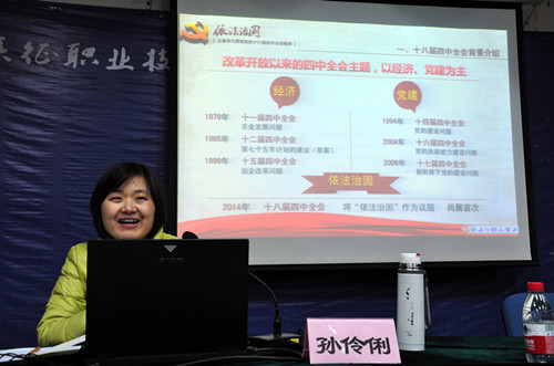 12月3日下午,中共浙江长征职业技术学院委员会学习贯彻十八届四中全会精神专题辅导会在1号楼1117室准时召开。学院领导和全体教职工党员参加了此次专题辅导会。学院思想政治理论教学部孙伶俐老师应邀作题为《全面推进 依法治国》的专题报告。