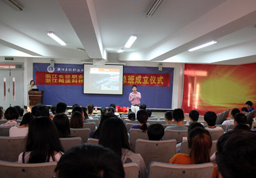 在剪彩及授牌仪式后,杭州网迷科技有限公司总经理桂强军先生首先给订单班的同学讲了第一课,他激情洋溢,介绍了网迷公司的现状、文化及愿景。他尤其提到,杭州网迷科技公司作为阿里巴巴集团的战略合作伙伴、中国电子商务服务业联盟的理事长单位,致力于打造全球首个电子商务生态博物馆,打造幸福的自由90创业园区,继续传承阿里富有社会责任感的企业理念,给到会的领导和师生上了生动的一课,引起了师生极大的兴趣。同学们积极提问,现场交流气氛良好。后期双方的订单培养工作将有条不紊地按照计划开展。(商务系供稿)