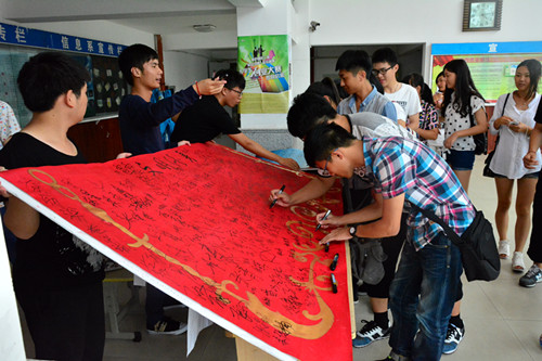 活动首先到各班宣传“文明修身,德与我行”大学生素质道德教育,争做文明先锋以及在各班教室粘贴文明修身标语。其次大一新生在晚自修期间开展主题班会并在班级负责人的带领下宣读修身宣誓词,并对提前五分钟进课堂和实行无手机课堂表示支持并严格遵守,气氛热烈。活动的最后是争做文明修身标兵的签字活动,天气虽炎热,但师生们踊跃参加,活动现场秩序井然。