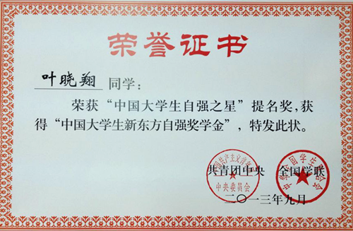 我院的叶晓翔同学荣获“中国大学生自强之星”提名奖,获得“中国大学生新东方自强奖学金”。