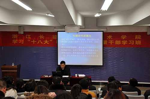 2013年1月18日上午,学院在1117教室举办“学习十八大精神,提高教育质量”为主题的干部培训班,学院全体科级以上干部(含教研室主任)参加了学习培训。