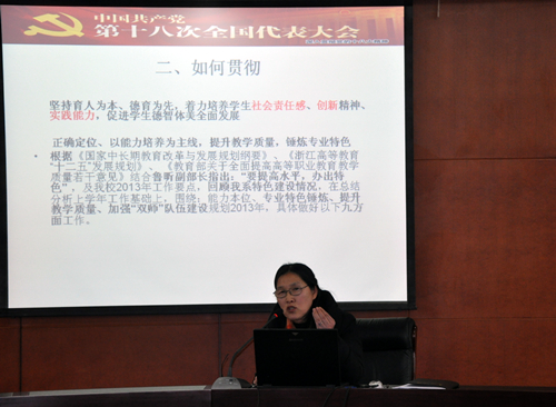 最后,学院执行院长吕振合教授作了《关于高等职业教育内涵发展的思考》专题报告。结合学习十八大精神,吕院长分析了高等职业教育面临的形势,阐述了以先进大学文化引领学院科学发展、以服务为宗旨,以就业为向导,走产学研结合道路、以创新的精神推动学院加快发展,以此推动高等职业教育内涵发展。