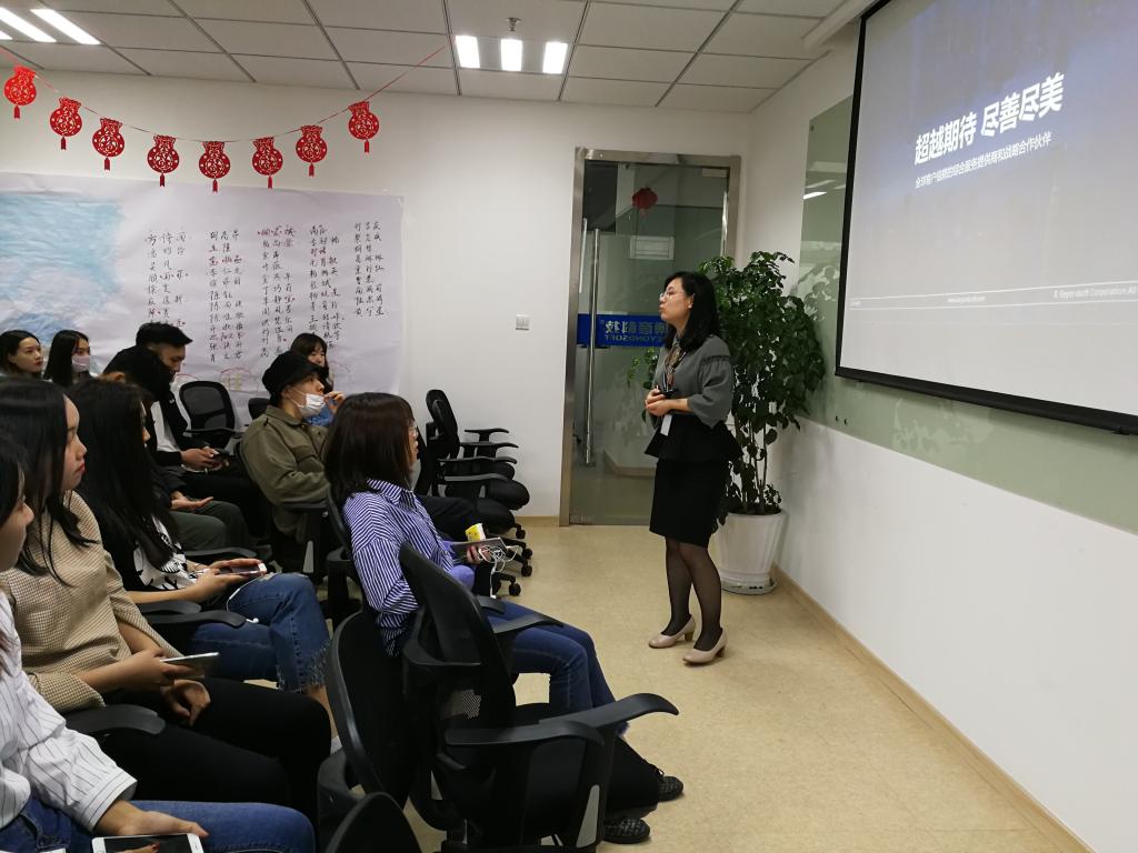 在杭州博彦的培训室,王丹笑经理为同学们介绍了公司的概况、发展历程和企业文化,她还着重介绍了公司招聘岗位中和商务英语专业相关的岗位群。在介绍过程中,同学们也就“相关岗位对于英语水平的要求”、“个人在企业的发展前景”等问题和王经理等进行了交流。随后,在该公司学习的15级学生分享了岗位实习经验。