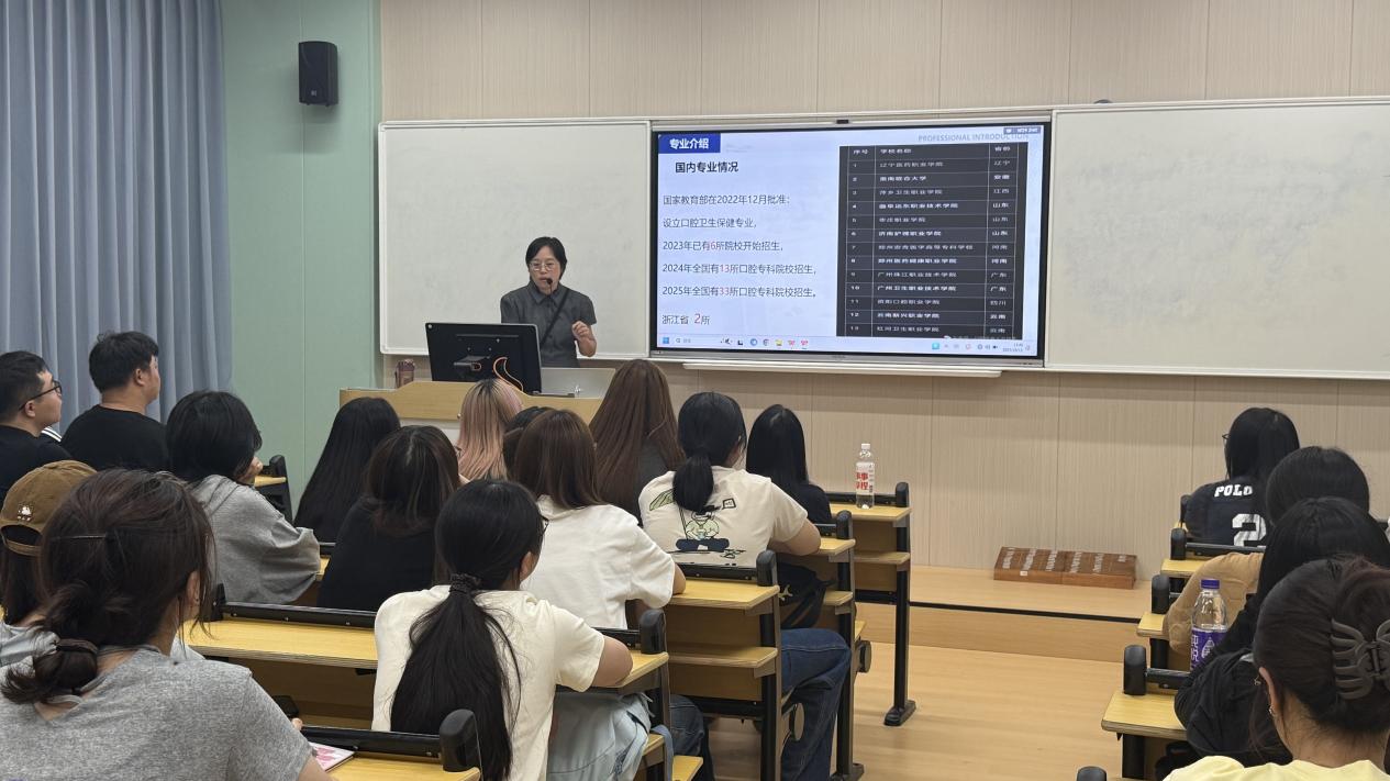 在口腔卫生保健专业的班级里,教研室主任吴一帆以“健康中国的守护者”为题开讲,清晰展现了专业发展的广阔前景。“预防大于治疗,我们的工作直接关系全民口腔健康水平。”吴一帆强调。刘萍萍老师则详细介绍了未来三年的学习规划,从课程设置到实习安排,帮助新生快速明晰学业方向。她寄语新生要扎实掌握各项操作技能,早日成为合格的口腔健康“守门人”。