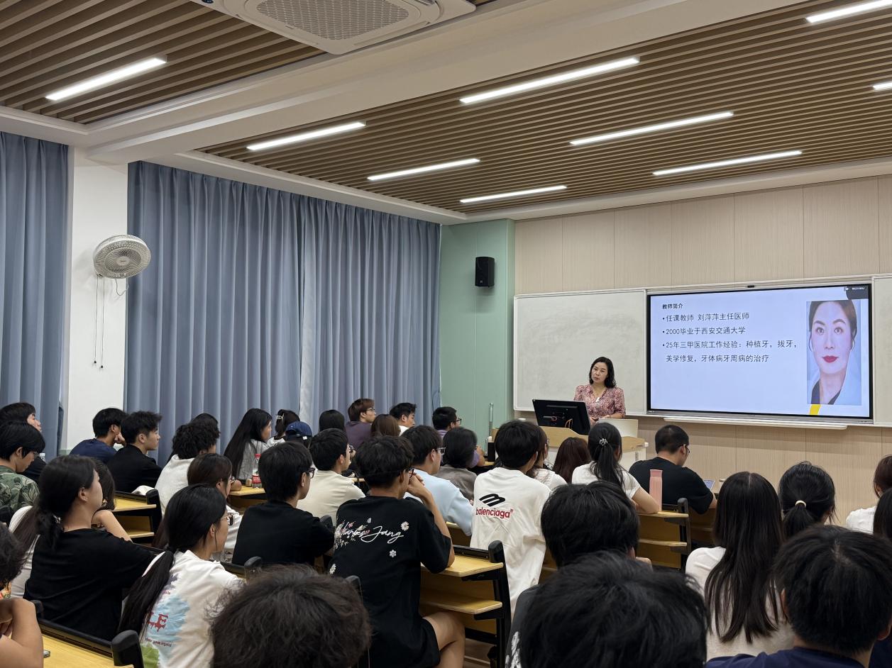 与此同时,在口腔医学技术专业的教室里,气氛同样热烈。张孟晶老师展示的精美义齿作品引得新生们赞叹不已。她从一枚全瓷冠的制作讲起,将专业形象比作“方寸之间的艺术与科学”。赵芹老师则聚焦行业发展趋势,重点介绍了数字化技术带来的变革,“CAD/CAM设计和3D打印已成为必备技能,但手上的‘硬功夫’和精益求精的工匠精神同样重要。”